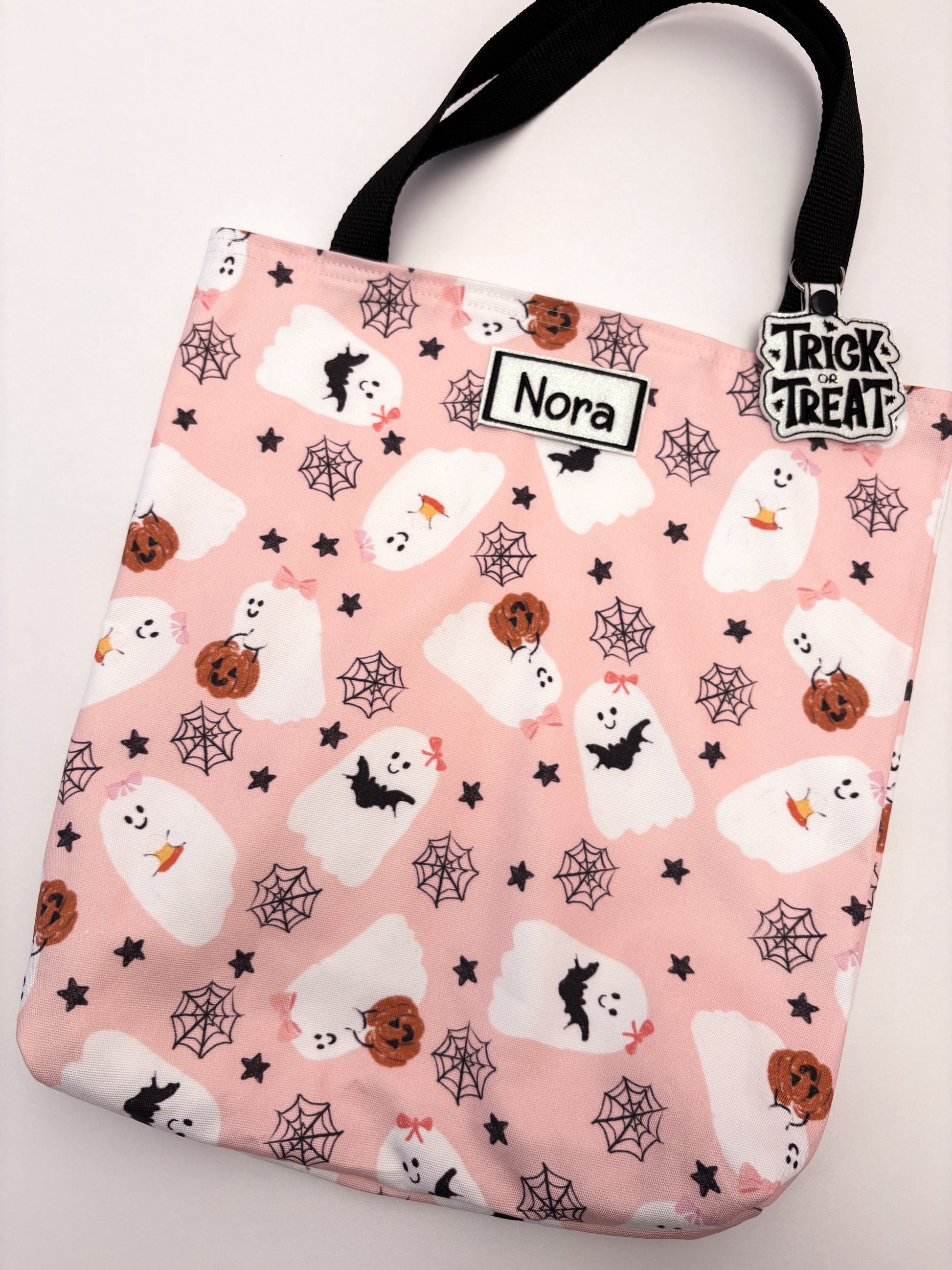 Make trick-or-treating extra special this year with a custom embroidered BOO Bag. These make the perfect keepsake for your little ones first Halloween and to use year after year! Each bag is made of durable sailcloth canvas, measures approximately 12.5'' wide by 13'' tall and is fully lined with white flannel. Your name choice is embroidered on glow-in-the-dark faux leather vinyl with black thread (1 name/word limit on each bag). Add-on keychains are $6 each. Please note the coordinating charm for each bag is photographed with the bag.