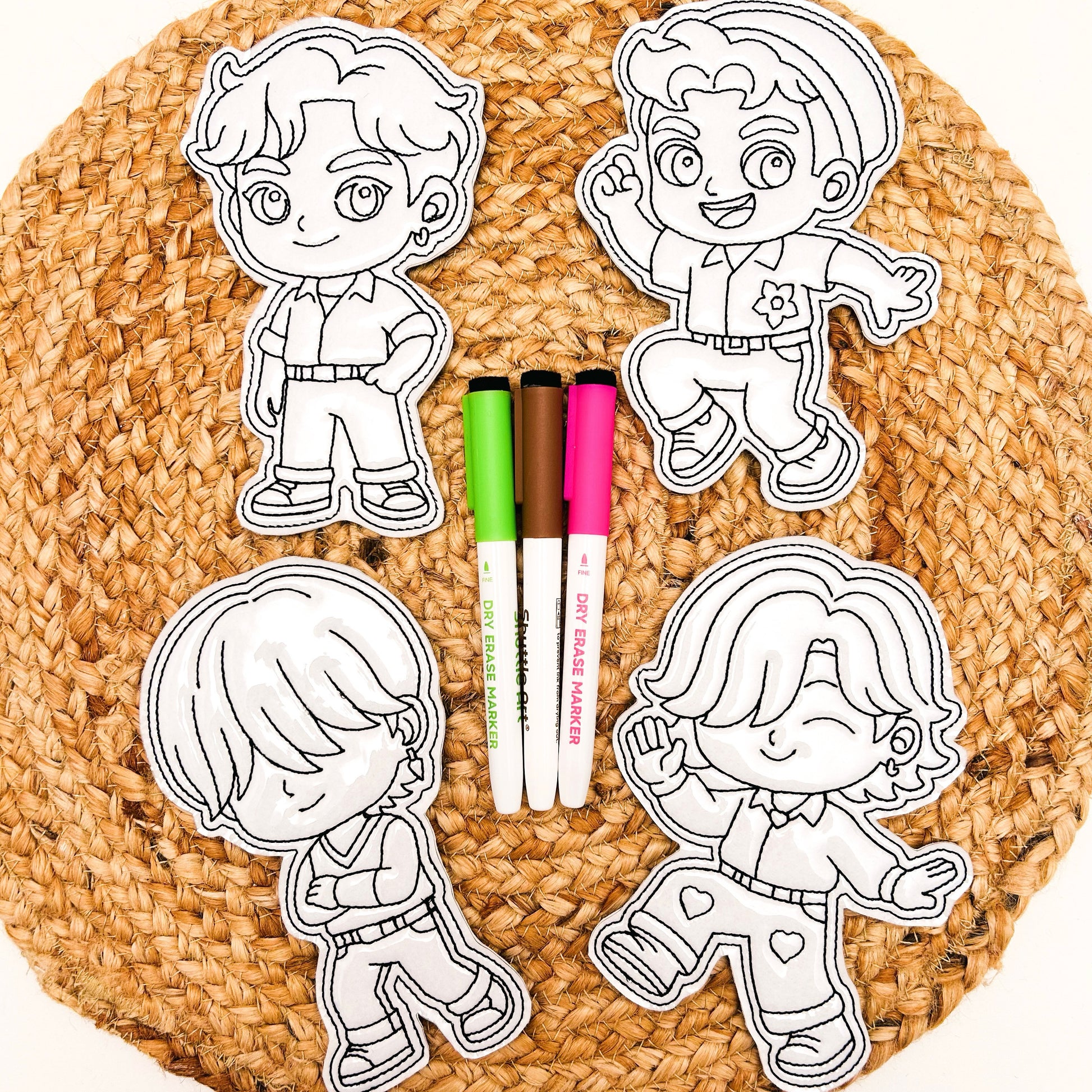 Our Doodle doll sets are vinyl characters with dry erase markers. Simply colour and wipe off with the eraser on the end of the marker or paper towel for endless hours of colouring fun. They are the perfect quiet time activity, great for waiting at appointments, for travel or to keep little ones busy while you prepare dinner. Each set includes three characters and three markers. Please note, marker colours will vary in each set.