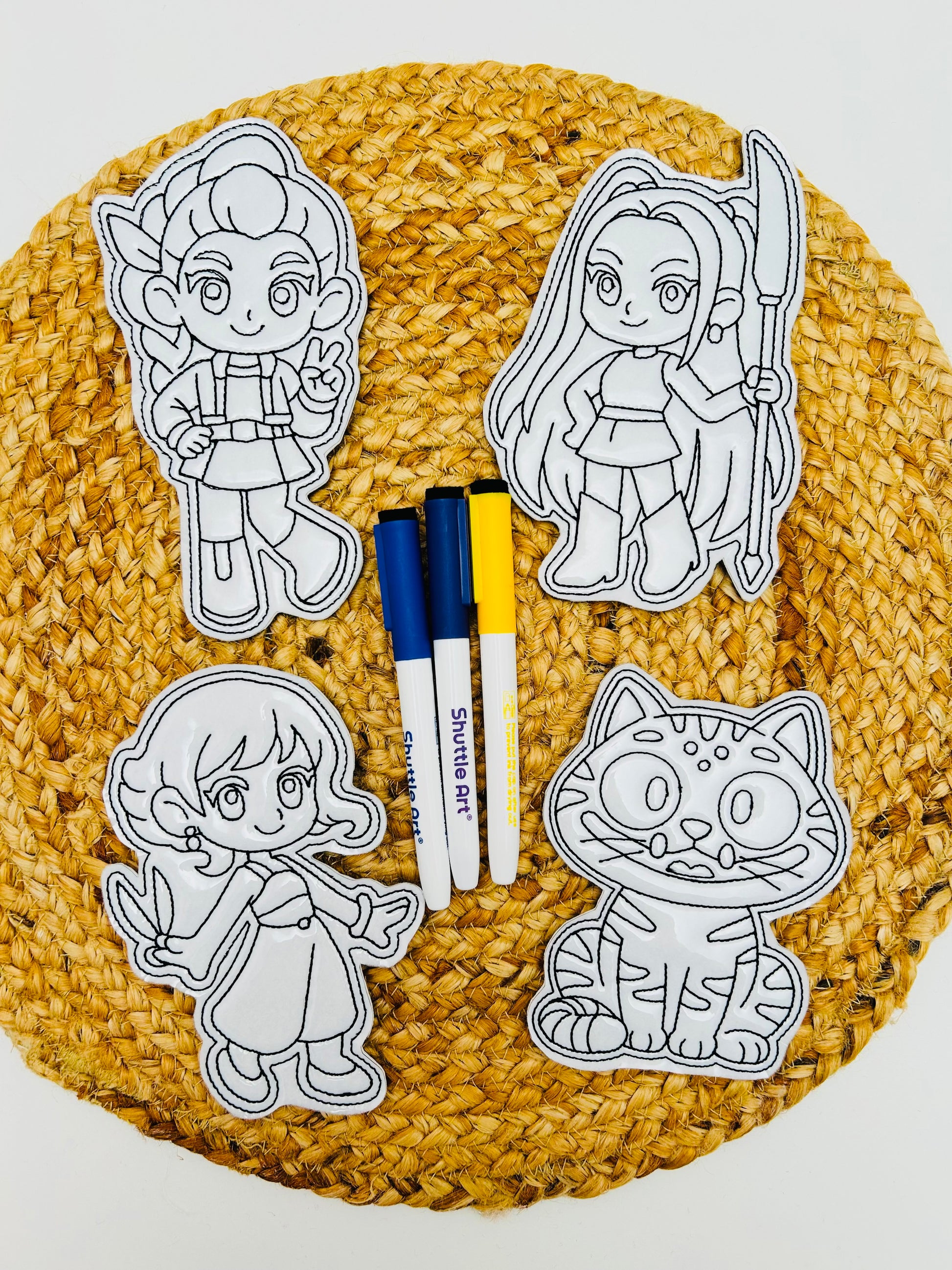 Our Doodle doll sets are vinyl characters with dry erase markers. Simply colour and wipe off with the eraser on the end of the marker or paper towel for endless hours of colouring fun. They are the perfect quiet time activity, great for waiting at appointments, for travel or to keep little ones busy while you prepare dinner. Each set includes three characters and three markers. Please note, marker colours will vary in each set.